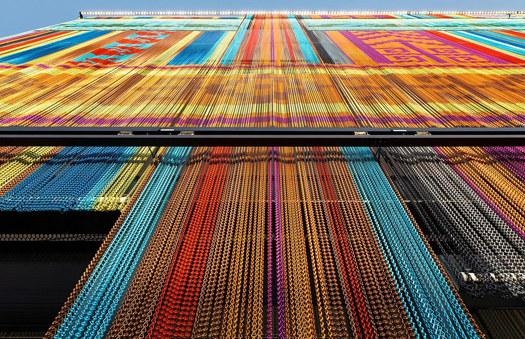 The pavilion’s envelope was created using Kriskadecor’s Metal Fabric Outdoor Cladding, an anodized and lacquered aluminum chain system that combined artistic flexibility with technical precision. Each chain link measured 11.86 × 23.20 × 8 mm with a 2 mm thread thickness, forming a lightweight, semi-transparent façade with 69.79% open area. This design enhanced ventilation, solar control, UV protection, and significantly reduced heat gain, contributing to the building’s environmental performance.