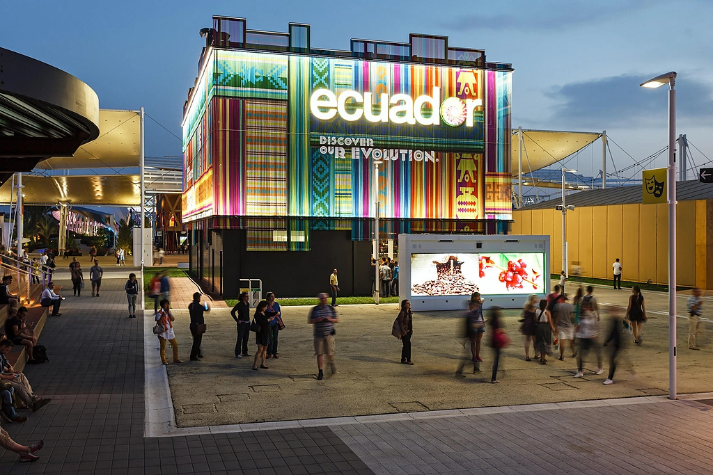 The Ecuador Pavilion at Expo Milano 2015 was designed as a vibrant showcase of Ecuador’s culture, nature, and innovation. Visitors were invited to “Discover Our Evolution” through a dynamic architectural language, with a multicolored façade inspired by traditional Ecuadorian textiles. The exterior shifted in tone and texture with every change of light, creating a living canvas that reflected the country’s rich heritage and ecological diversity.