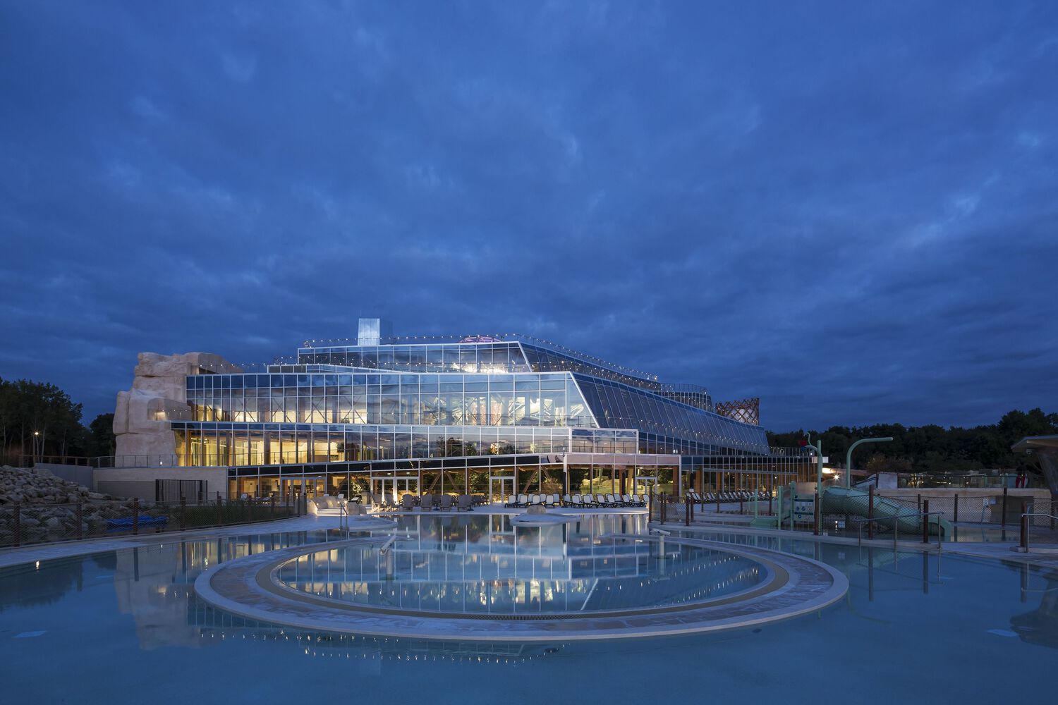 The Aqualagon Water Park, designed by Ferrier Marchetti Studio, is a year-round aquatic destination at Villages Nature Paris. Nestled next to a lake and integrated into the surrounding forest, the park offers indoor and outdoor pools, water slides, terraces, and recreational areas, creating a seamless connection between leisure and landscape. Its design establishes the park as a visible landmark while harmonizing with the natural environment.