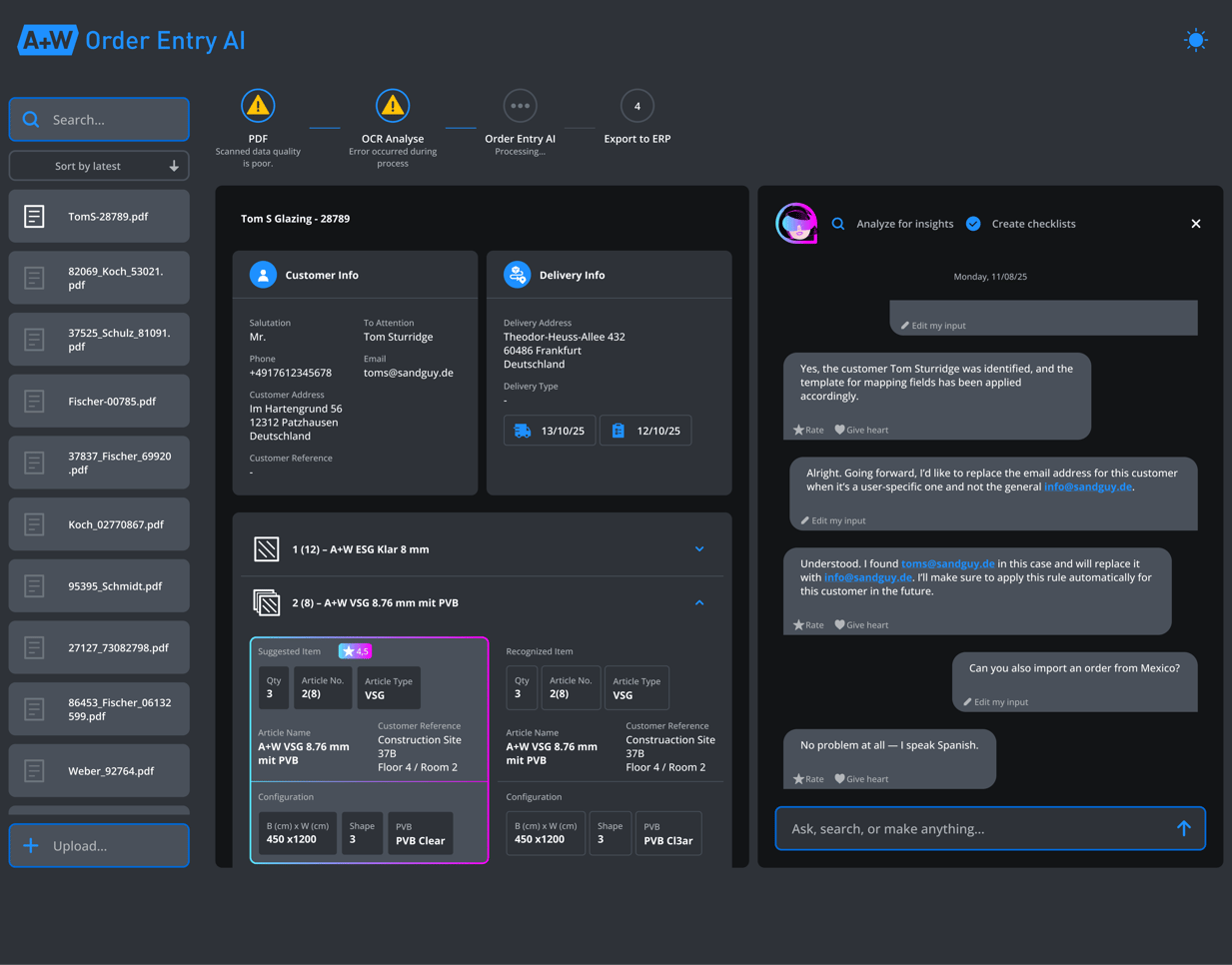 Originally developed for approval workflows, Mira automatically captures orders, submits them for staff review, and learns from corrections to enhance future accuracy. Now, users can also chat directly with Mira in the A+W Cloud to define custom rules, such as assigning a permanent contact email for a specific client.