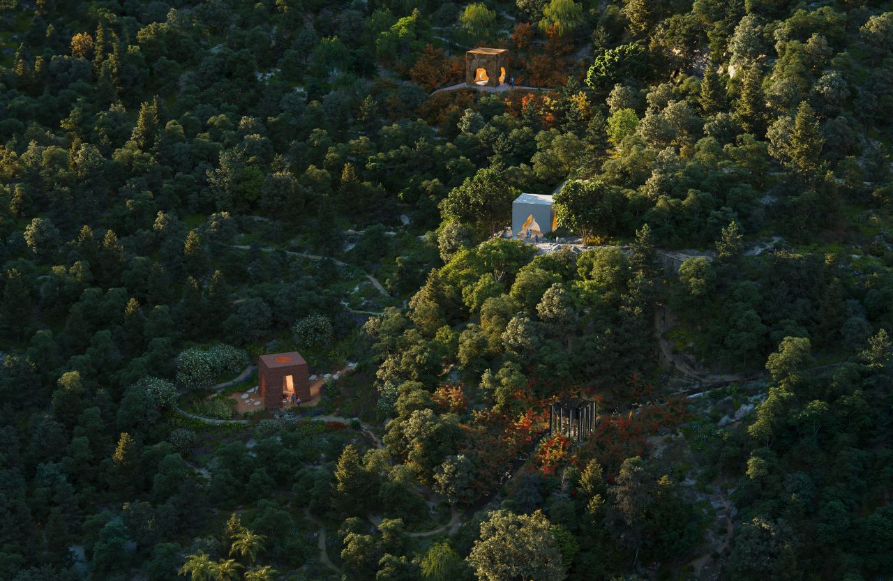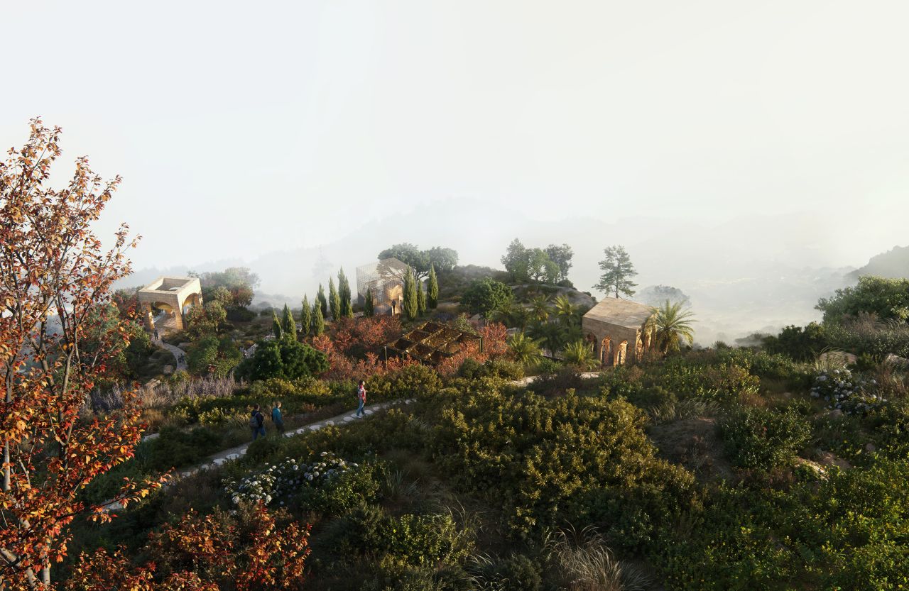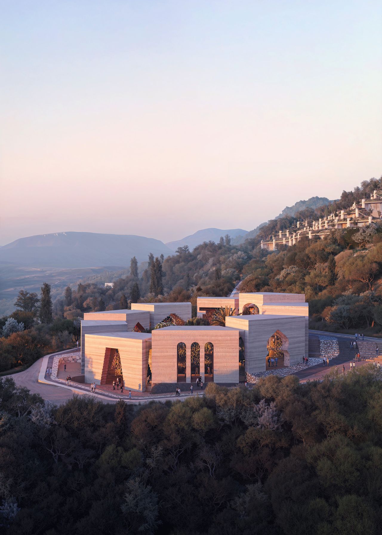 Laid out as a genealogical tree of faith, the park branches from a central origin in the valley into three routes, guiding visitors through gardens, olive groves, and forested slopes toward nine pavilions, each dedicated to a distinct spiritual tradition. The pavilions are crafted with materials reflecting their heritage: Jerusalem limestone for Judaism, colored Italian marble for Christianity, white sandstone mosaics for Islam, and granite, onyx, marble, and river-polished stone for Dharmic and East Asian traditions.