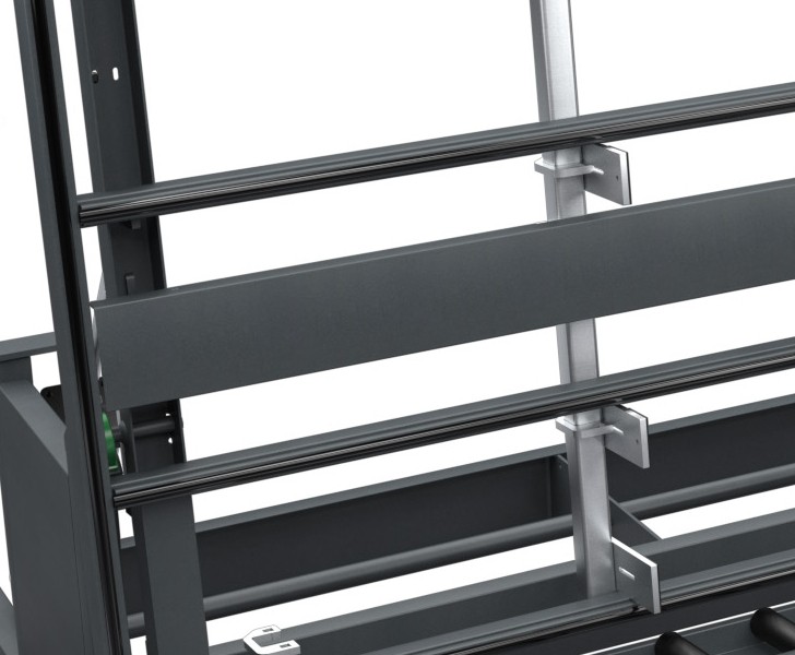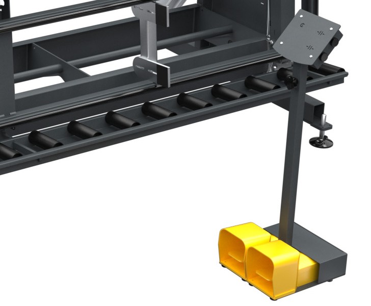 A central console provides bi-manual control for locking and unlocking frames, while a double footswitch manages both tilting and horizontal profile rollers. The pneumatically-operated tilting roller conveyor enables smooth horizontal translation of heavy frames, giving operators full autonomy when feeding or retrieving them.