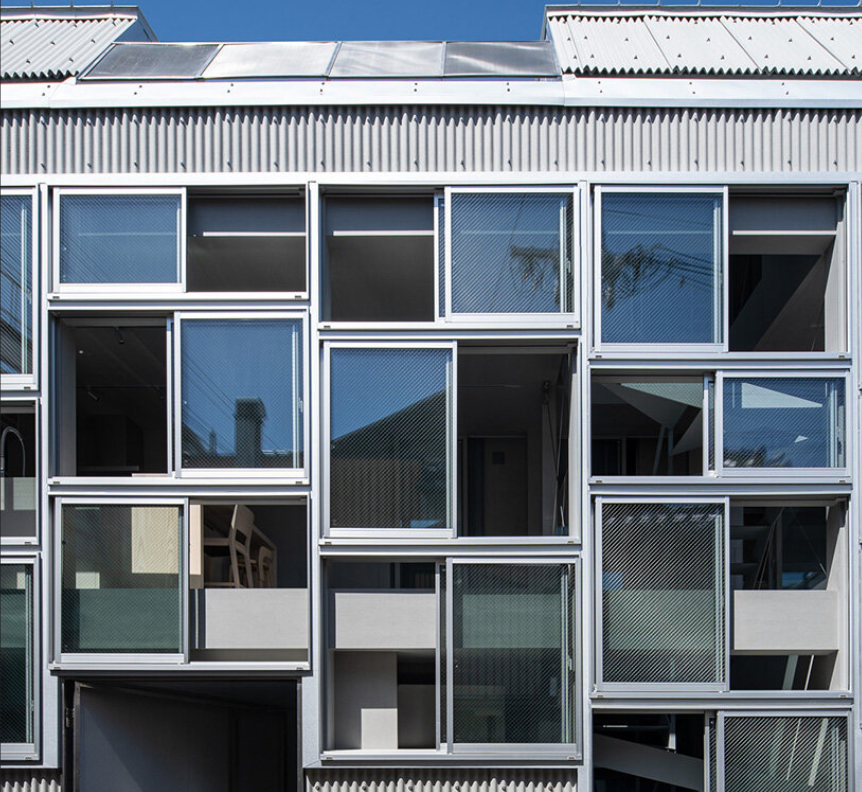 Rather than shielding the interior from its surroundings, the architects embraced openness. The façade’s stacked, modular design captures changing light and reflections from neighboring houses, the arcade across the street, and the ever-active city beyond. Each window can be individually opened, enabling residents to tune airflow, light, and privacy while staying connected to the atmosphere of the shopping arcade beside it.