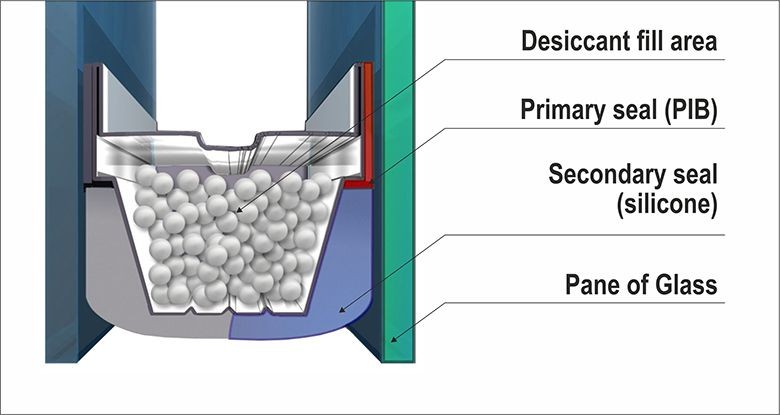 The image above shows where the desiccant sits inside an insulated glass unit, contained within the spacer bar to keep the cavity dry and condensation-free